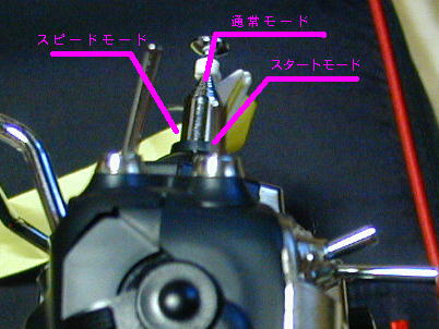 | スピードモード スピードモードのセッティングです。 フラップとエルロンを共に上へ若干(2〜3ミリ)跳ね上げる機能です。 Xantipaでは強風時に前へ出なくなった時などに使っています。 こちらも 前面真ん中のつまみと跳ね上げげ角を連動させて、風の強さなどに応じ て跳ね上げ角を調整出来るようにしています。 |
