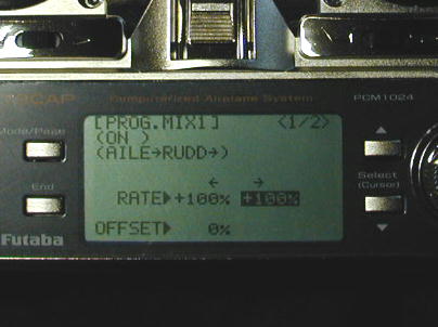 | エルロン−ラダーミキシング プログラムミキシングを一つ使って、エルロンからラダーへのミキシングを設定 します。 これはXantipaのセットで、レートは100%になっています。 2/2の画面でミキシングをON−OFFするスイッチをBに割付を行っています。 高速飛行時にカット出来るようにするためです。 |
