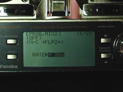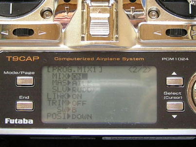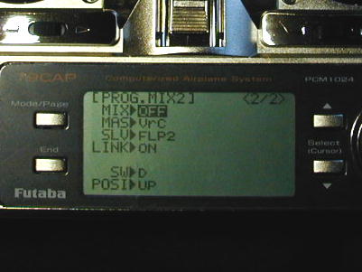 | 滞空モード プログラムミキシングで、ボリュームのCからFLAP2へミキシングを行います。 前面の右側のつまみでフラップの下げ角が調整出来ます。 2/2の画面です。 SW−D(右前)のスイッチでON−OFF出来るように設定しています。 上のセッティングだけではフラップの動作だけですので、FLAP−AILEミキシング (予め用意されている)を使って連動させます。 これもSW−D(右前)のスイッチ でフラップと同じようにON−OFFする事で連動するようにしています。 |