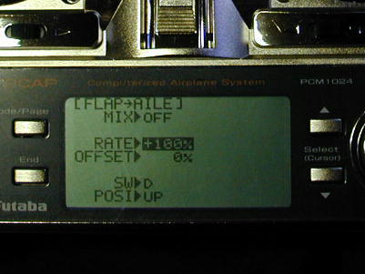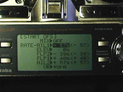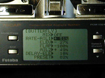 | バタフライ ブレーキのセッティングです。 フラップサーボの動作量を稼ぐためにフラップの レートは最大になっています。 また、一番下の行はブレーキ動作時のエレベ ーターのダウン量ですが、かなり大きな数字になっています。 これは、飛行さ せながらトリムで調整した量が反映されています。 |