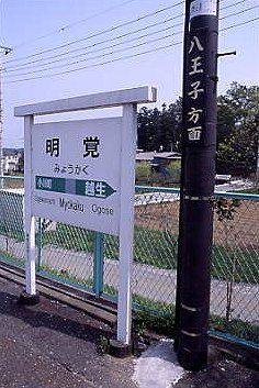 | 明覚に戻って来ました。 ここの駅舎は10年ほど前に焼失しています。 これは、生き残った看板でしょうか。 金網に取り付けたのが無造作ですね。 |