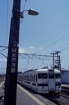 ホームに立つ木製の電柱と、取り付けられた照明。