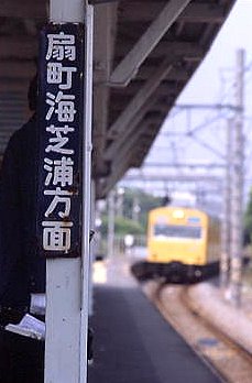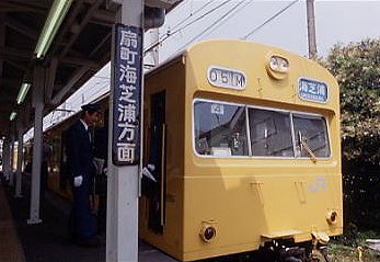 ホーローの向こう、カナリア・イエローの103が来た。