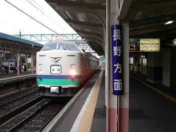 手前に長野方面、向かいのホームに直江津方面が並んでいます。