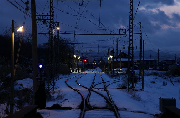 しんと静まり帰った構内を踏切から望む。聞こえてくるのは耳元をそよぐ風の音だけ。