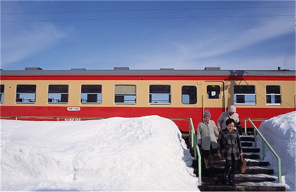 冬の晴れ間に、列車を降りるお客さんの表情も明るい。