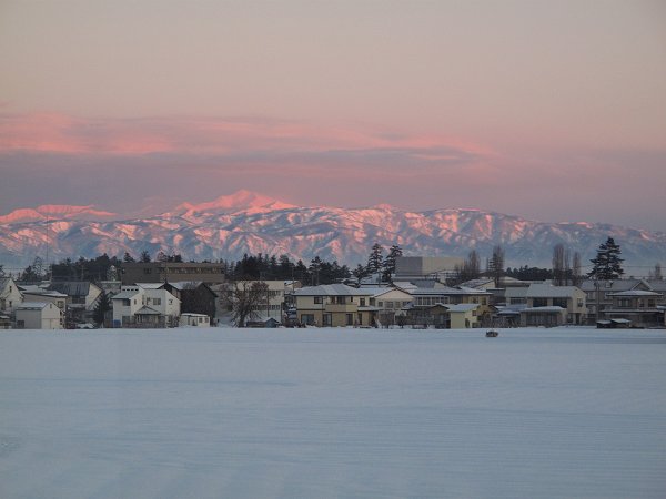 米沢発の2番列車に乗る。車窓からは米沢盆地を囲む山並みに差す朝日が見えた。
