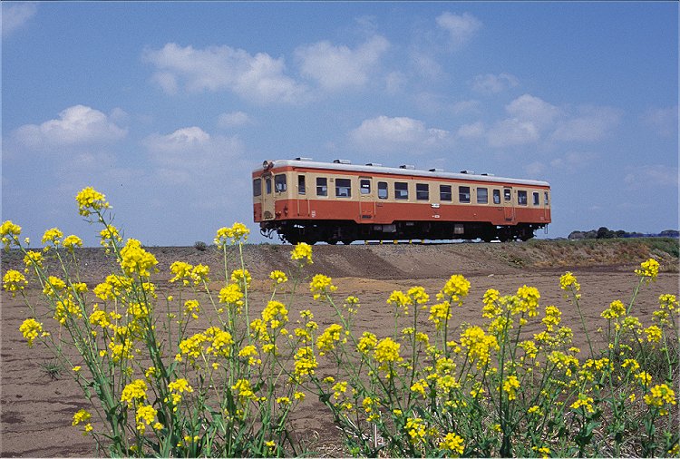 線路端に菜の花を見つけ列車を待つ、やがてタイフォンが聞こえると、キハ20が軽やかに通過した。(2006/04/30 平磯ー磯崎)