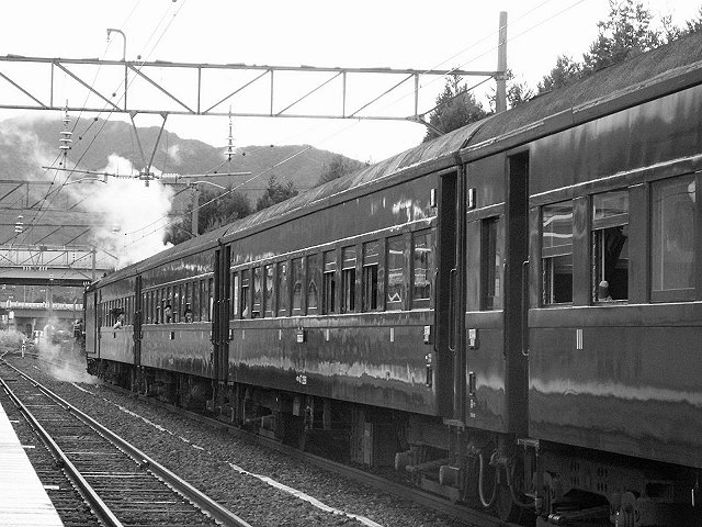 ここで旧客を見るのは四半世紀ぶり、あの頃は赤い電機の牽引だった。(猪苗代)