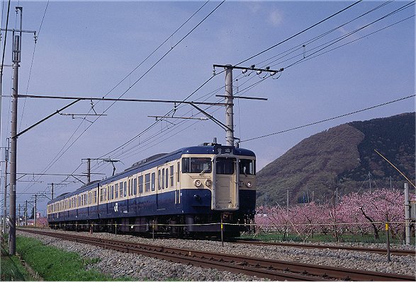 甲府盆地の沿線は桃の花が美しい。