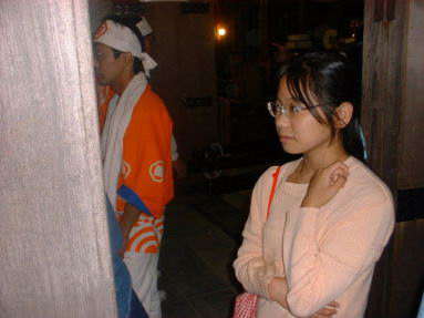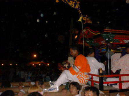 | 郷ダンジリは、小型なので、タイコをたたく人は、2人しか乗られません。 デジカメの付具合でしょうか、雪のようなハレーションが移ってしまいました。 |