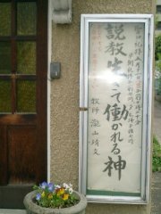 教会の門の前で、あなたが最初に目にするのは、礼拝案内の看板です。 説教の題目が大きく書いてあります。関連する聖書の箇所も。 私どもの教会の看板は、高橋兄の奉仕によるものです。 |