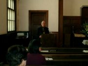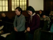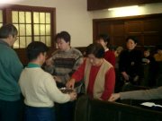 講壇から下りた牧師が、会員のために祈りを捧げます。神学生のために、病気の人のために、旅の途中の人のために、高齢者のために、受験生のために、生まれた赤ちゃんのために。 | お祈りの後で、次回の礼拝の中で歌われる聖歌の練習をします。